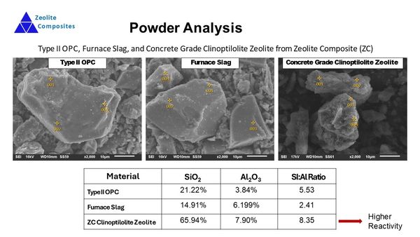 The zeolite from Zeolite Composites is uniquely suited as an alternative SCM material for the replacement of OPC in traditional concrete materials and products because of its naturally occurring silica, alumina, and other key elements in the right amounts and ratios important for OPC replacement.