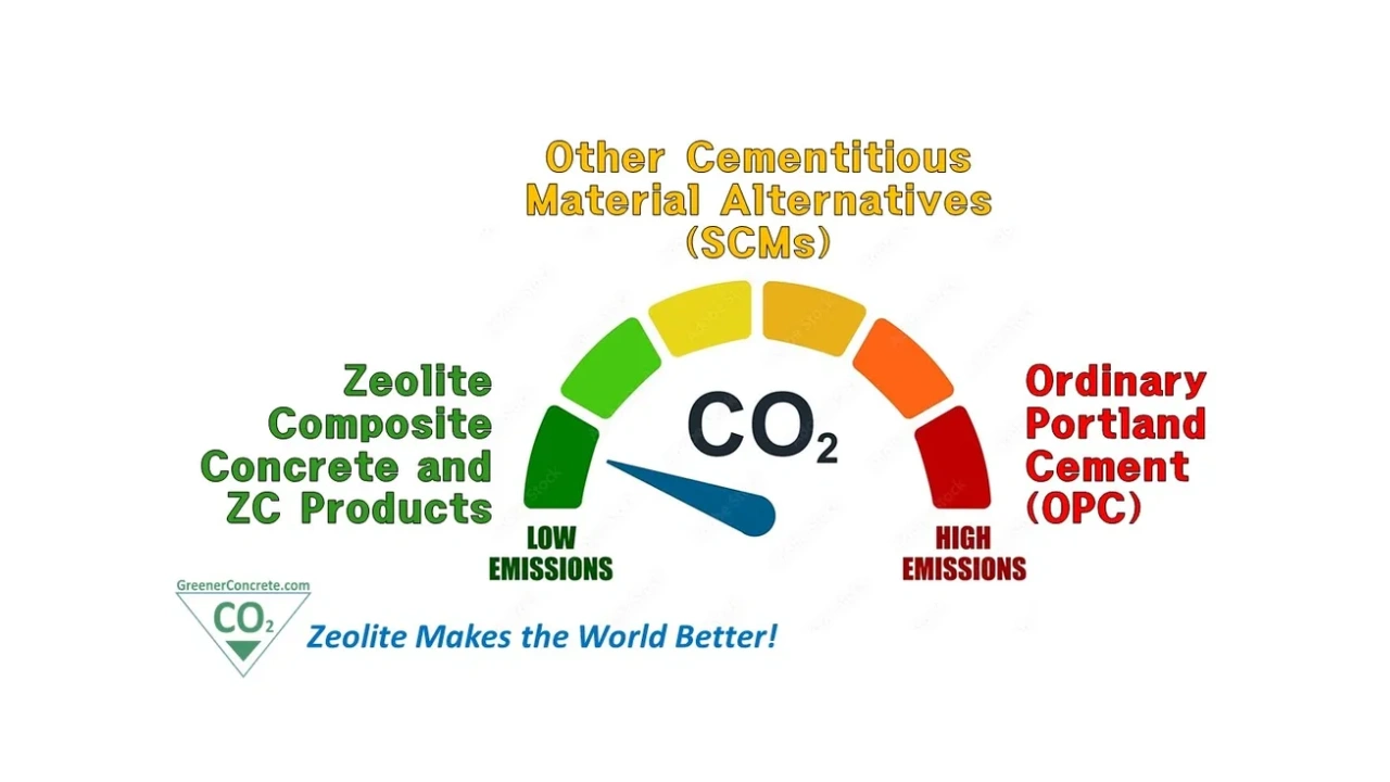 Zeolite, a naturally occurring and abundant pozzolan is the most eco-friendly alternative SCM to OPC and has the smallest overall NET carbon footprint and the smallest total impact on the environment.