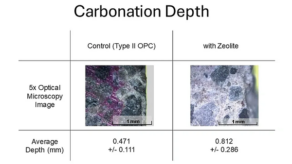 GWP is a measure of the overall environmental impact of materials, particularly in terms of greenhouse gas emissions (CO₂ equivalent) on our planet. Although minimal, the GWP of our clinoptilolite zeolite is NOT zero because of the mining and milling operations required to source the material. The GWP of our zeolite is currently estimated to be around 2% (0.02 kg CO₂ per kg of zeolite produced). This is a very small number relative to the 0.922 tons of CO₂ prevented for every ton of OPC replaced with our clinoptilolite zeolite. It is worth noting that our clinoptilolite zeolite can further reduce embodied carbon through carbonation (i.e., post cure atmospheric CO₂ absorption and sequestration), which may result in a total net GWP percentage that is close to zero or perhaps even negative. Research is currently in process to determine the rate and amount of post cure CO₂ absorption and sequestration.